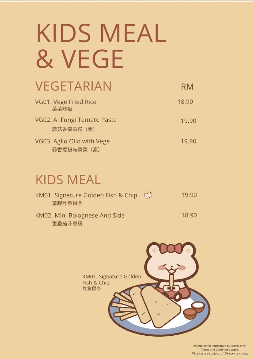 The menu offers a variety of dishes suitable for casual dining, including soups, pasta, burgers, and local favorites. Guests can choose from options such as mushroom soup, pocket cordon bleu with cream sauce, bacon carbonara, and a crispy cheeseburger. There are also Asian-inspired dishes like chicken katsu ramen, aglio olio duck, and 鲁肉饭 (braised pork rice).